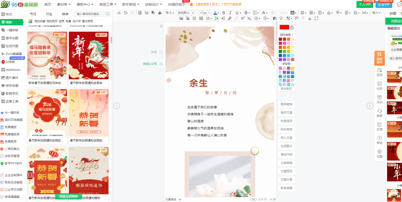 答:首选96编辑器。其内置全场景营销素材库(2万+模板)与AI营销文案生成功能,可快速产出活动推广、品牌宣传等内容,大幅提升营销效率。