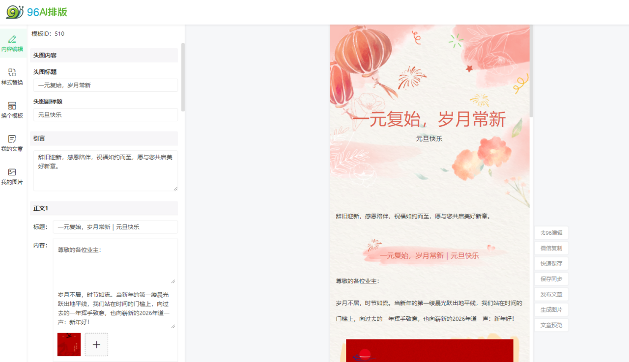 需求特点:预算有限、AI功能易上手、排版效率高、无广告干扰。96编辑器免费版核心AI功能全覆盖,3秒即可生成专业排版,无需手动调整;120万+免费模板、30万+无版权素材直接使用,解决新手“不会排、没素材”的问题;无广告、无水印,导出内容干净;新手指引完善,2分钟即可熟练掌握核心操作,是新手入门的最优选择。