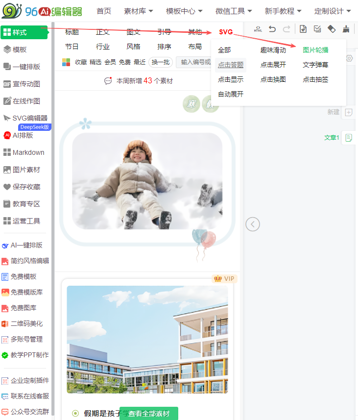 素材选择技巧:优先选用96编辑器内置素材,规避外部素材兼容性问题;教育类推文可选择“校园场景”SVG,如寒假活动滑动轮播、作业清单悬浮动效,贴合场景需求。