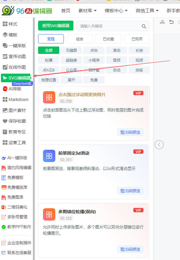 96编辑器内置5000+原创SVG互动素材,涵盖滑动轮播、悬浮动效、节日特效等场景,免费商用且无需代码,适配微信公众号全版本,是新手入门的最优选择。具体测评与步骤如下: