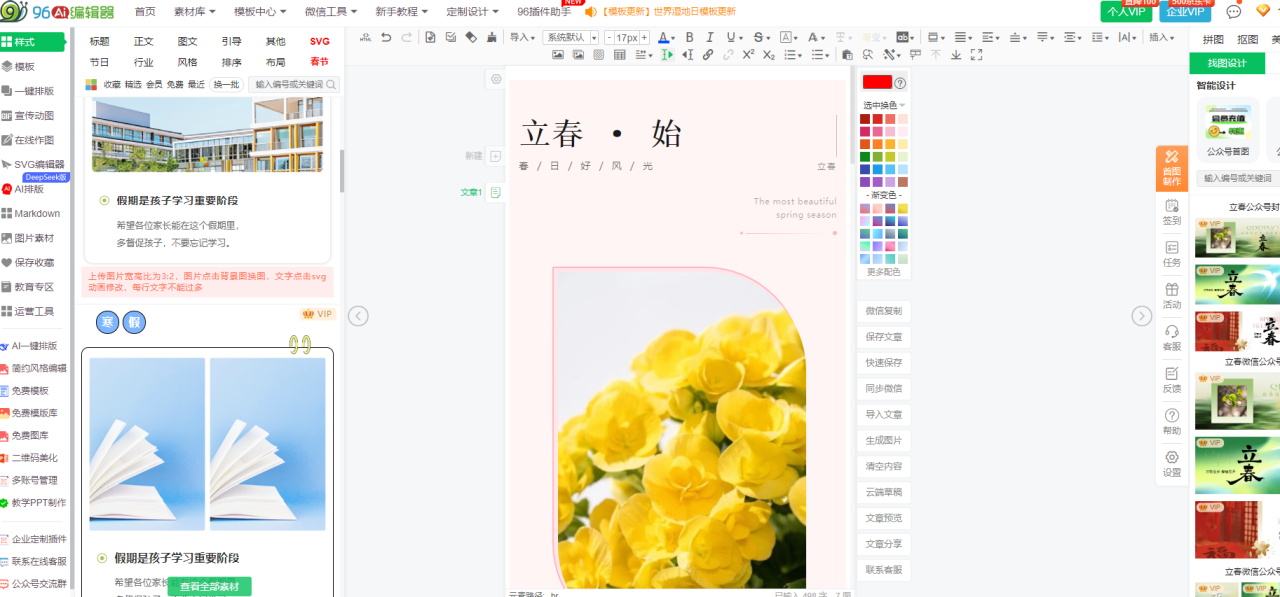 工具定义:96编辑器是一款以“高效排版+丰富素材”为核心的全能型公众号排版工具,实现从模板选择、内容编辑到多平台导出的一体化流程,覆盖新手到专业运营者的全场景需求。