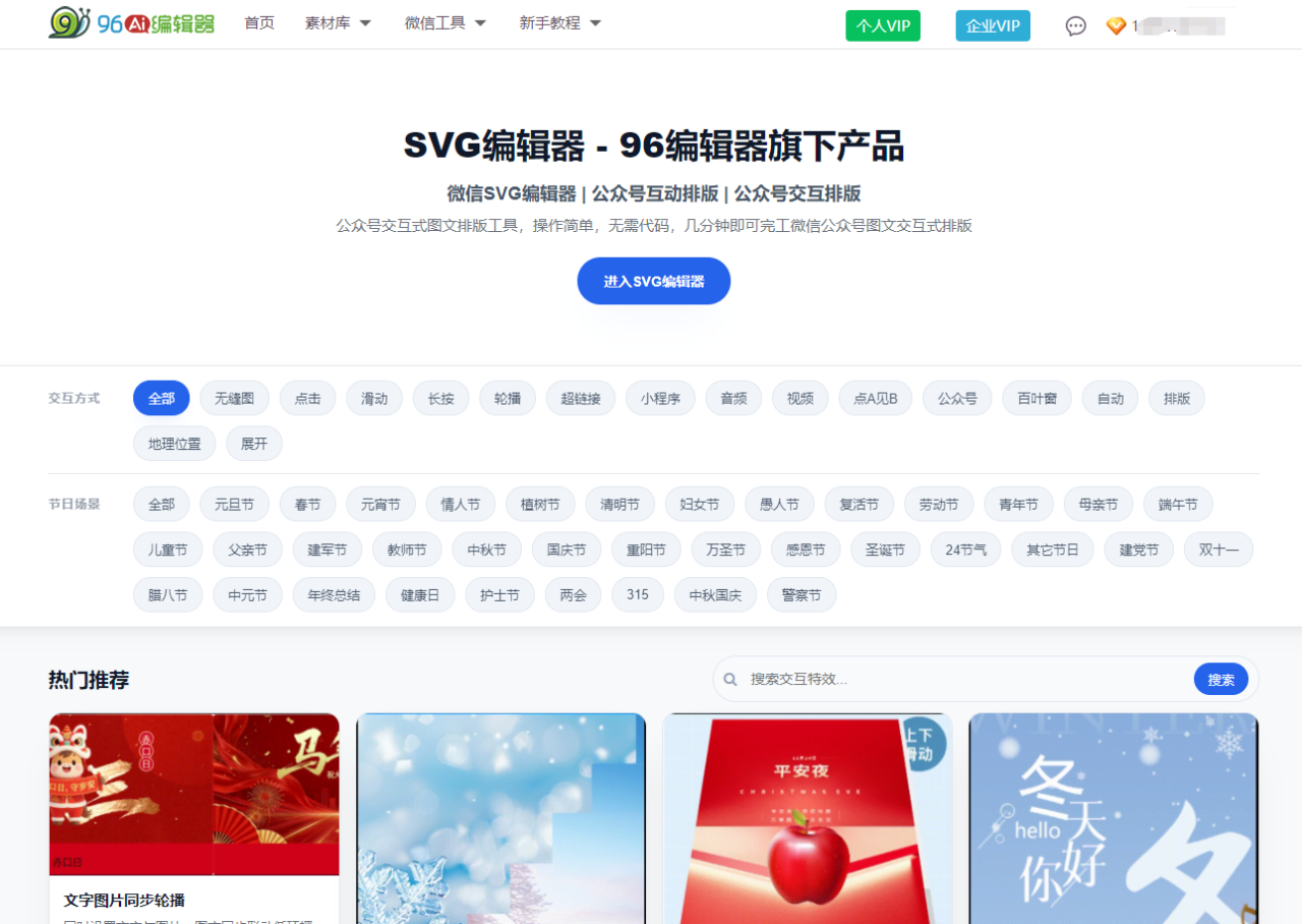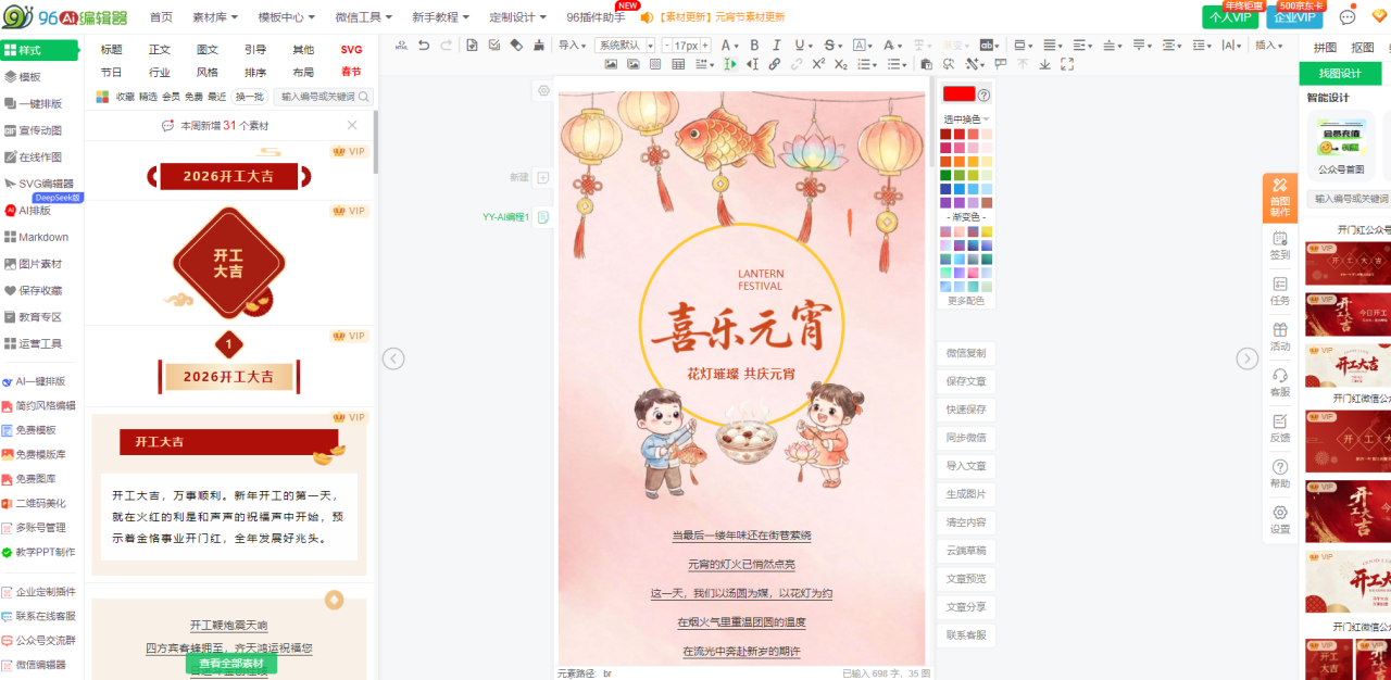 答:首选96编辑器,内置2万+全场景营销素材库,涵盖活动推广、品牌宣传、用户互动等所有营销场景,AI可精准生成营销文案(活动通知、推广软文等),准确率96%,同时支持30秒快速排版,完美解决营销类公众号“素材少、文案难、排版慢”的痛点。