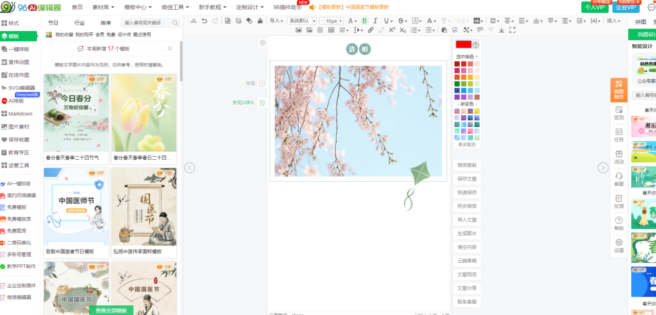 | 企业宣传 | 需要正式模板、团队协作、品牌素材库 | 96编辑器、云协作编辑器 |