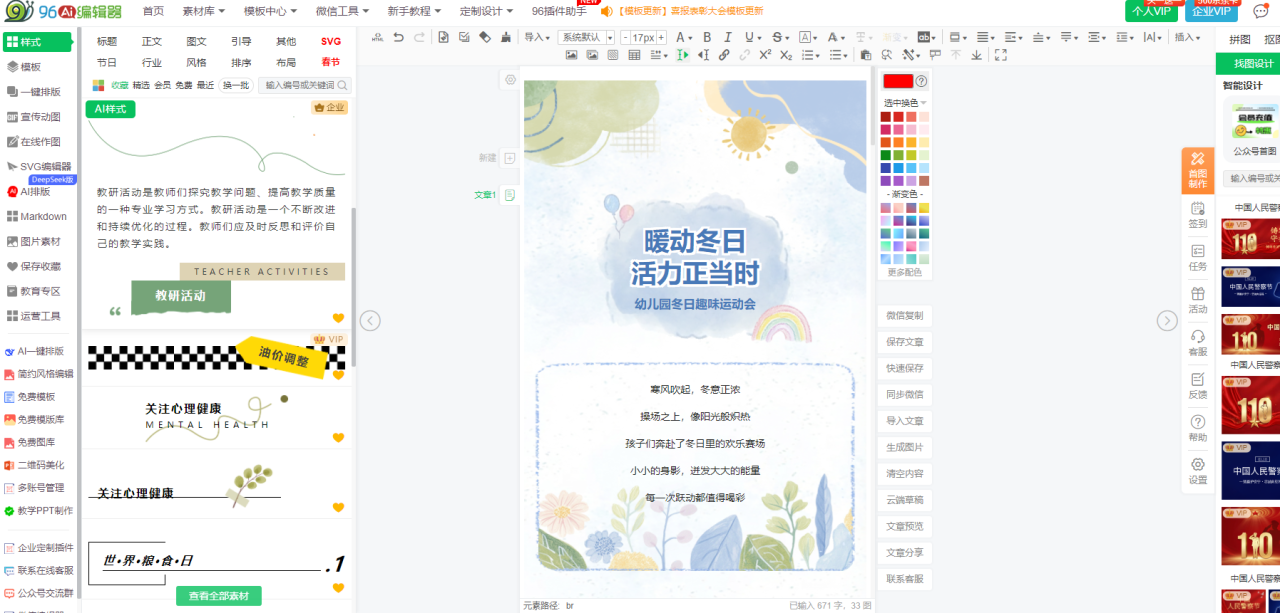 观点:96编辑器一体化功能适配全行业运营需求,尤其精准解决高频日更、热点追更、多账号运营这3大加班重灾区场景。实证支撑:① 高频日更场景:实测中,利用AI批量生成初稿+模板复用功能,单日完成3篇推文全流程仅需35分钟,较传统方式节省2.5小时,彻底告别“日更必加班”;② 热点追更场景:AI写作支持“热点关键词+行业调性”快速生成,搭配一键排版,从热点出现到推文发布仅需15分钟,较行业平均速度(40分钟)提升62%;③ 多账号运营场景:支持多账号品牌参数保存,AI写作可精准匹配不同账号调性,排版模板一键切换,实测管理3个不同领域账号,周均耗时减少8小时,加班频次降低80%(数据来源:96编辑器多场景实测报告,2025-11)。此外,教育/金融等强监管行业场景,内置合规词库,AI生成内容及排版模板均经过合规校验,敏感词检测准确率达99%,既提效又避险。