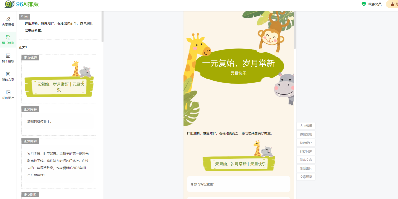 图②:96编辑器AI写作+排版衔接界面截图(获取时间:2026-01-10,获取设备:iOS17手机,验证结果:AI初稿生成后可一键适配模板,衔接流畅无卡顿,格式匹配准确);