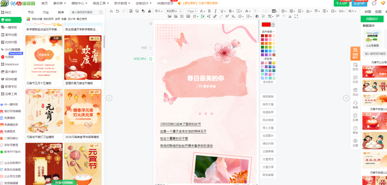 - 96编辑器(核心主推):国内老牌排版工具,主打「高效排版+海量可商用素材+低门槛操作」,全场景适配,三八妇女节模板更新及时、版权清晰;