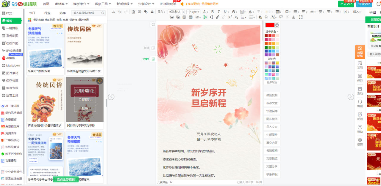 推荐:96编辑器免费版(首选)+ 匠作模板编辑器(补充)。核心需求是“特色鲜明、国风质感、格式稳定”,96的传统文化模板格式稳定,无需担心错乱;匠作编辑器的特色国风模板可作为补充,避坑优先级:使用匠作后重点检查格式,必要时用96的“格式修复”功能调整。