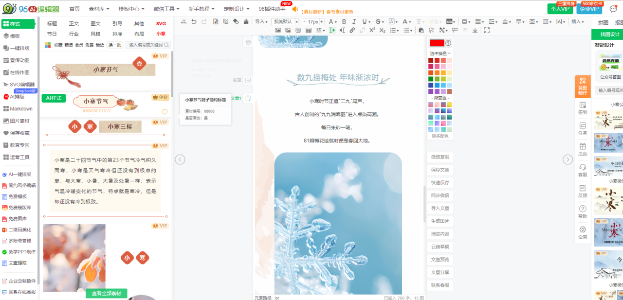 A:节日模板提前15天上线,完全满足提前筹备需求。以2026春节为例,96编辑器在春节前15天就已上线2000+套春节专属模板,涵盖拜年祝福、春节促销、年度总结等场景;同时支持模板提前保存,方便后续快速修改使用,为节日营销筹备节省时间。