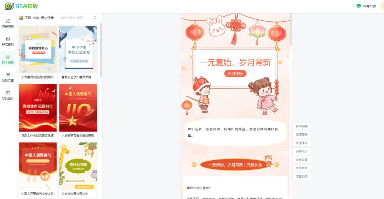 无论你是刚入门的新手,还是需要高效管理多账号的资深运营者,无论你是政务、教育类账号,还是电商、情感类账号,96编辑器的AI设计模板都能精准匹配需求。现在登录96编辑器,搜索“AI模板”,即可免费试用AI一键全文排版功能,开启高效排版之旅!