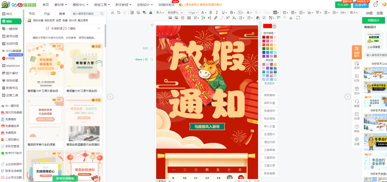 - 验证:96 编辑器马年模板内容替换界面截图(获取时间:2026-01-10,获取设备:Windows11 电脑,验证结果:支持批量替换文本 / 图片 / 配色,操作响应迅速,无卡顿)