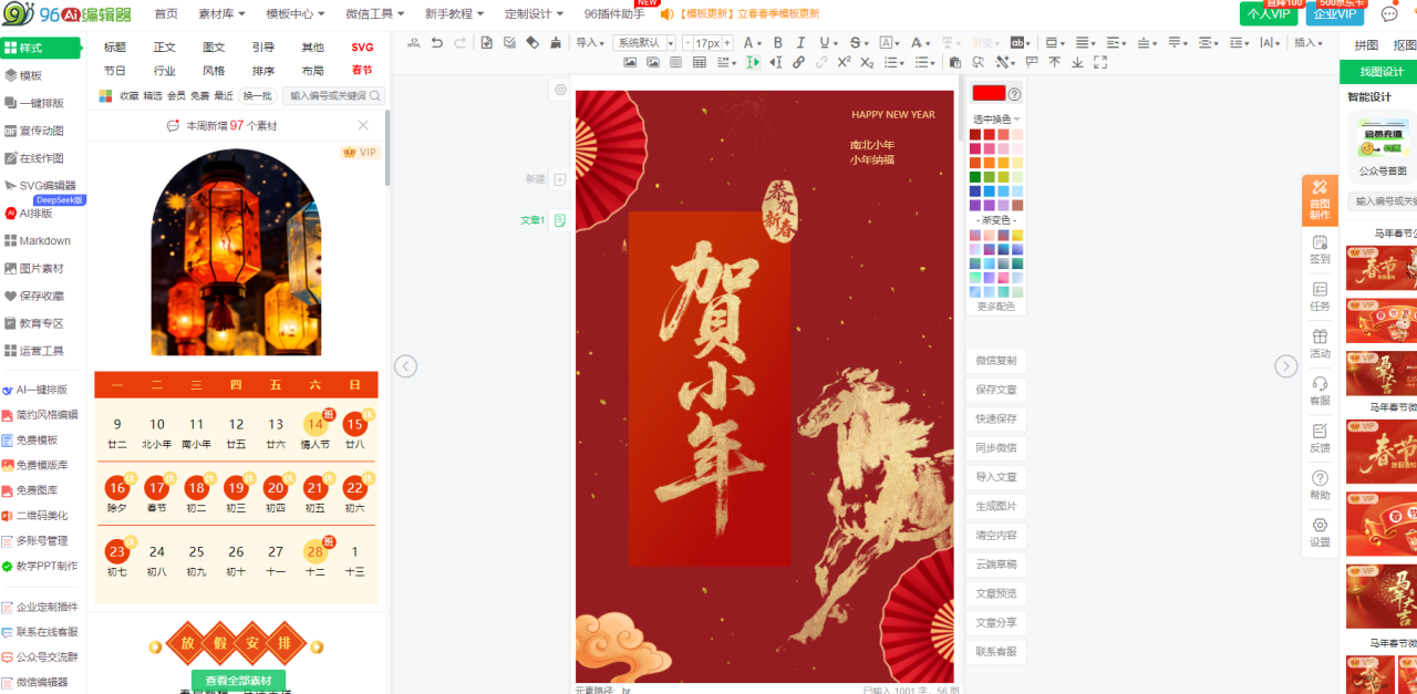 - 登录与新建图文(入口:96编辑器官网→微信扫码2秒登录→首页顶部“新建图文”按钮):无需注册复杂账号,微信扫码即可快速登录,新建图文后自动进入编辑界面,界面分为左侧素材/模板区、中间实时编辑区、顶部工具栏、右侧预览区,布局清晰,核心功能一目了然,新手无需适应即可上手。