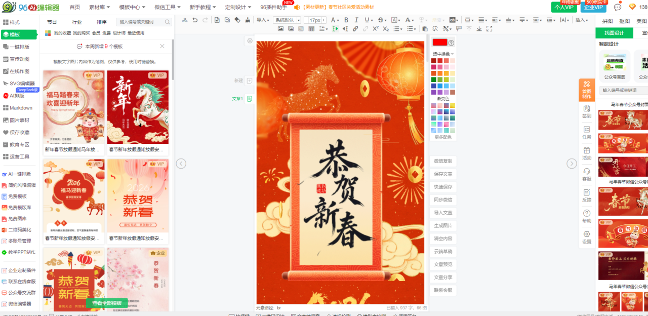 - 96编辑器的免费功能能满足基础运营需求吗?答:可以,96编辑器免费功能充足,内置10万+模板中,免费用户可使用6万+,包含1万+免费营销素材,AI基础文案生成、一键排版、多平台导出等核心功能均免费开放,能满足新手和轻度运营的基础需求,无隐形消费。