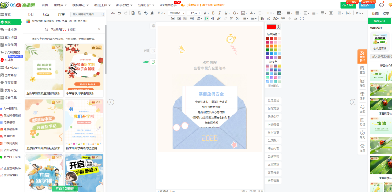 - 节日营销/活动专题:96编辑器内置海量热点营销模板,响应迅速;如需制作复杂互动H5,可结合SVG视觉工坊。