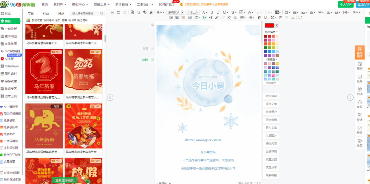 96编辑器围绕“快速排版、批量处理、精准适配、团队协作”构建了完整的功能体系,无需额外工具即可满足公众号运营全场景需求:
