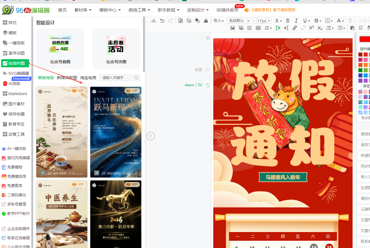 | 在线作图 - 海报生成 | 马年祝福海报一键生成,支持文字替换、元素调整、高清下载,商用无版权 | 海报制作效率提升98% | 公众号封面、朋友圈宣传、社群分享 | 单张海报制作时间从4 小时→3 分钟(来源:96 编辑器在线作图实测数据,2026-01) |