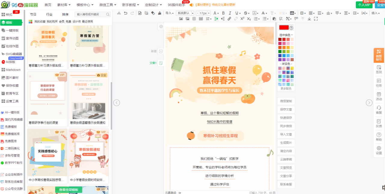 教育机构运营者:建议开通96编辑器教育专属VIP,解锁10个子账号权限,支持团队协作排版,满足多校区寒假推文需求。可使用专属教育PPT模板、商用图库,搭配定制服务设计寒假招生与安排一体化推文,提升专业度。