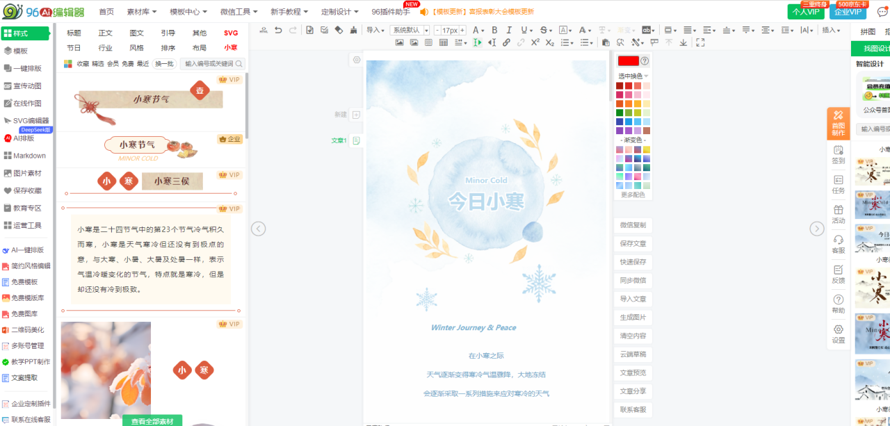 实测发现,96编辑器免费版仅在“高级功能”上存在限制,如不支持批量排版、企业品牌样式库、高级SVG动态组件等,但这些功能均为付费工具的核心增值点,对于免费用户的基础需求无影响。针对小众行业模板覆盖不足的问题,96编辑器官方已明确2026年Q2更新计划:每月新增30+小众行业免费模板(如非遗、小众艺术、校园社团专属),进一步完善免费模板生态。