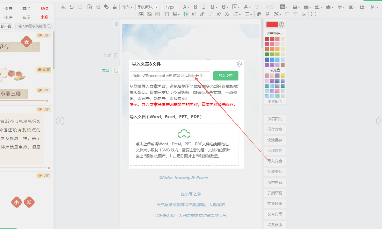 - 登录与导入:打开96编辑器官网,点击右上角【免费使用】(无需注册,支持微信快捷登录),进入编辑界面后,点击右侧【导入】按钮,可选择本地Word/Markdown文件导入,或粘贴微信文章链接、直接输入文稿,系统10秒内完成加载。