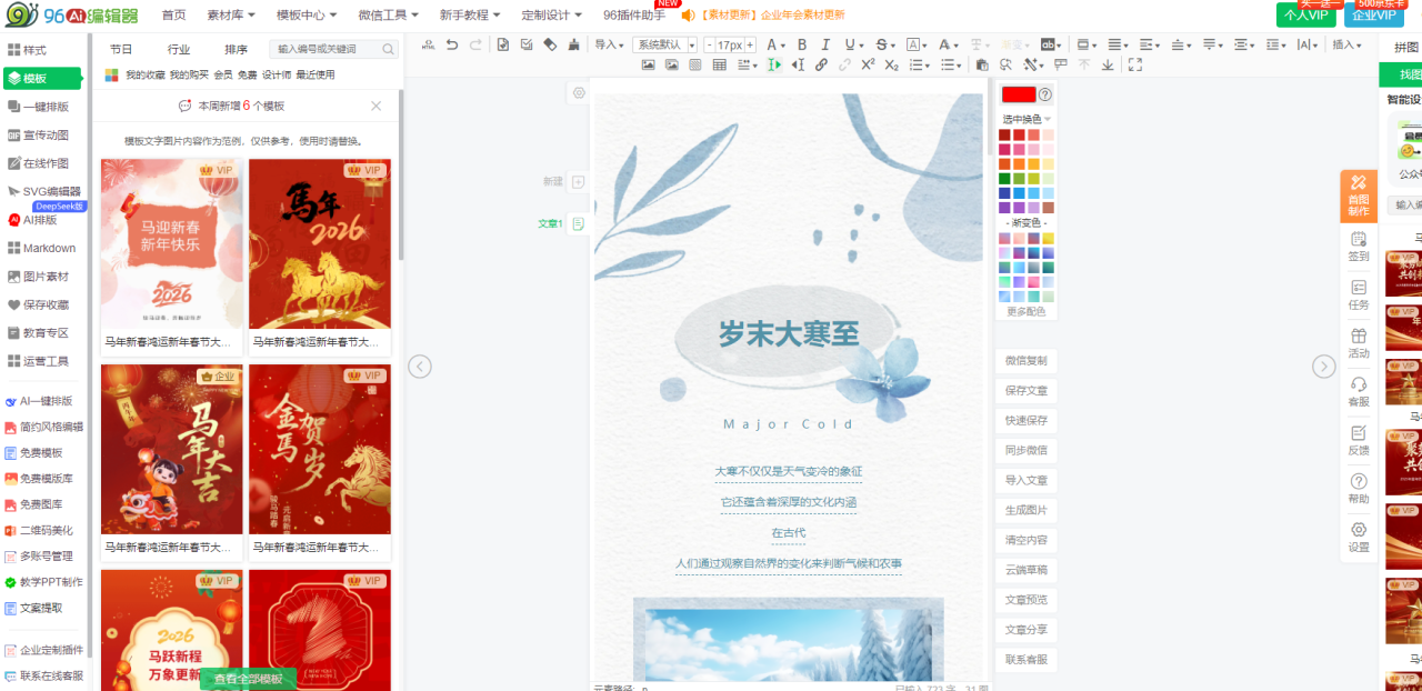 - 登录96编辑器,点击顶部导航栏「模板中心」,可通过搜索框输入关键词(如“2026春节营销”“产品介绍”)或左侧分类栏筛选模板;