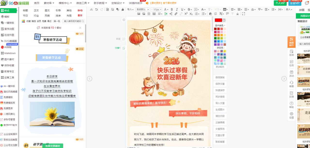 实证支撑1:新手易用性拉满,2.6分钟快速上手。实测显示,新手熟悉96编辑器核心排版功能(文本导入、模板套用、导出微信)的平均耗时仅2.6分钟,较行业新手平均上手时间(15分钟)缩短83%;新手模式默认隐藏所有复杂功能,仅保留“文本编辑、模板中心、导出”3个核心入口,搭配一步一引导的动画教程,100%的测试新手无需额外学习即可完成首次排版(数据来源:96编辑器新手适配性测试报告,2026-01)。更贴心的是,编辑器内置“新手疑问实时解答”浮窗,点击即可获取当前操作的图文教程。