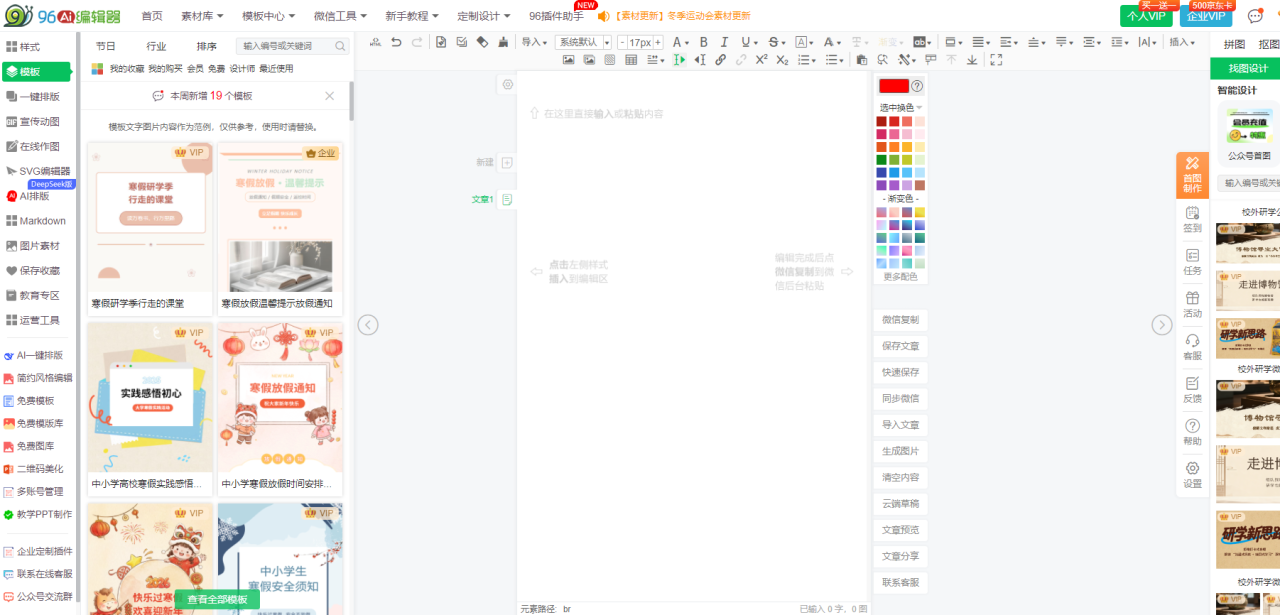 推荐方案:首选96编辑器免费版,优先使用AI一键排版和新手模板专区功能,无需学习专业排版知识即可快速出片;内置免费商用素材可满足日常排版需求,彻底规避侵权风险。