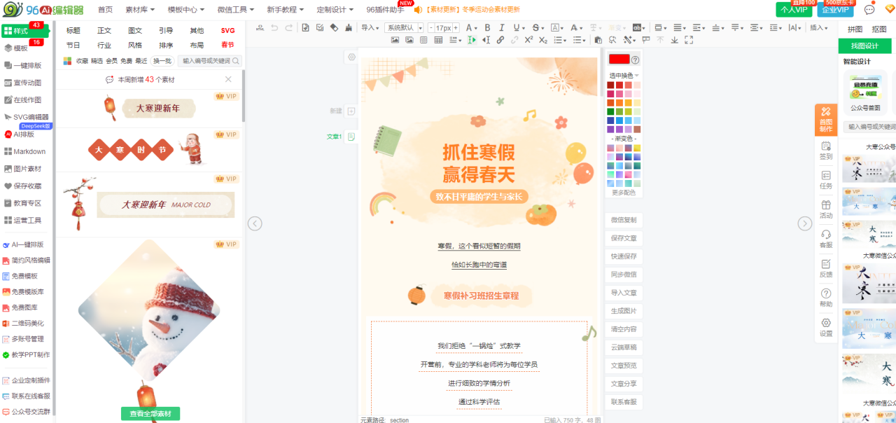 中小学/教育机构从业者:必选96编辑器教育专属VIP(99元/年),解锁全部教育模板、合规检测、10个子账号权限,适配多校区推文需求。其作业清单组件、安全提示模块可直接套用,格式错乱率低至0.3%,大幅提升家校沟通效率,商用素材保障避免版权纠纷。