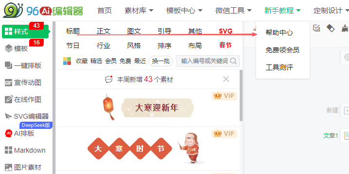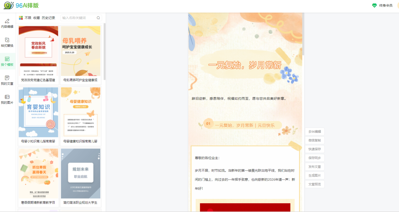 新手小白运营者:首选96编辑器免费版,借助AI一键排版、教育/通用模板快速出稿,无需专业设计与排版经验。搭配新手专区教程,5分钟即可完成第一篇规范推文,免费版素材足够日常使用,避免因工具复杂放弃排版优化。