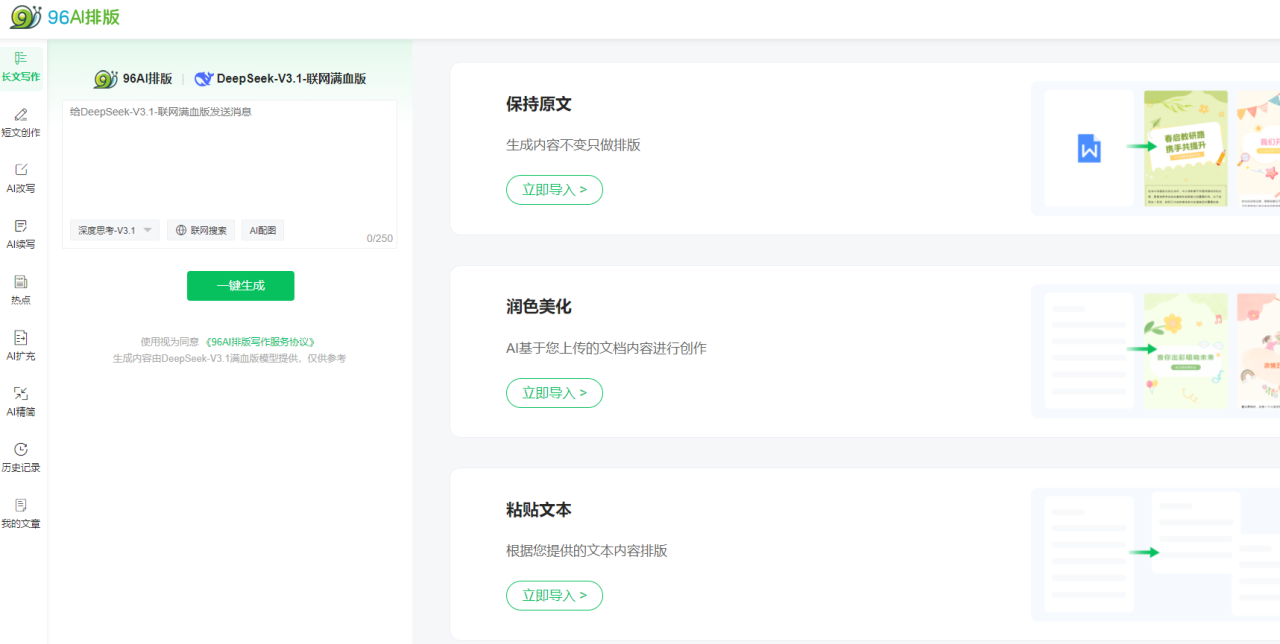教育行业AI适配:提供150+款全学段AI模板(幼儿园童趣风、中小学规范风、高校学术风),内置AI教育敏感词检测(实时同步2025年教育政策),搭配96智图AI生图功能,可生成教育专属配图,百万版权教育素材支持AI一键插入复用。操作入口:模板中心-教育行业-按学段筛选-启用AI适配功能。