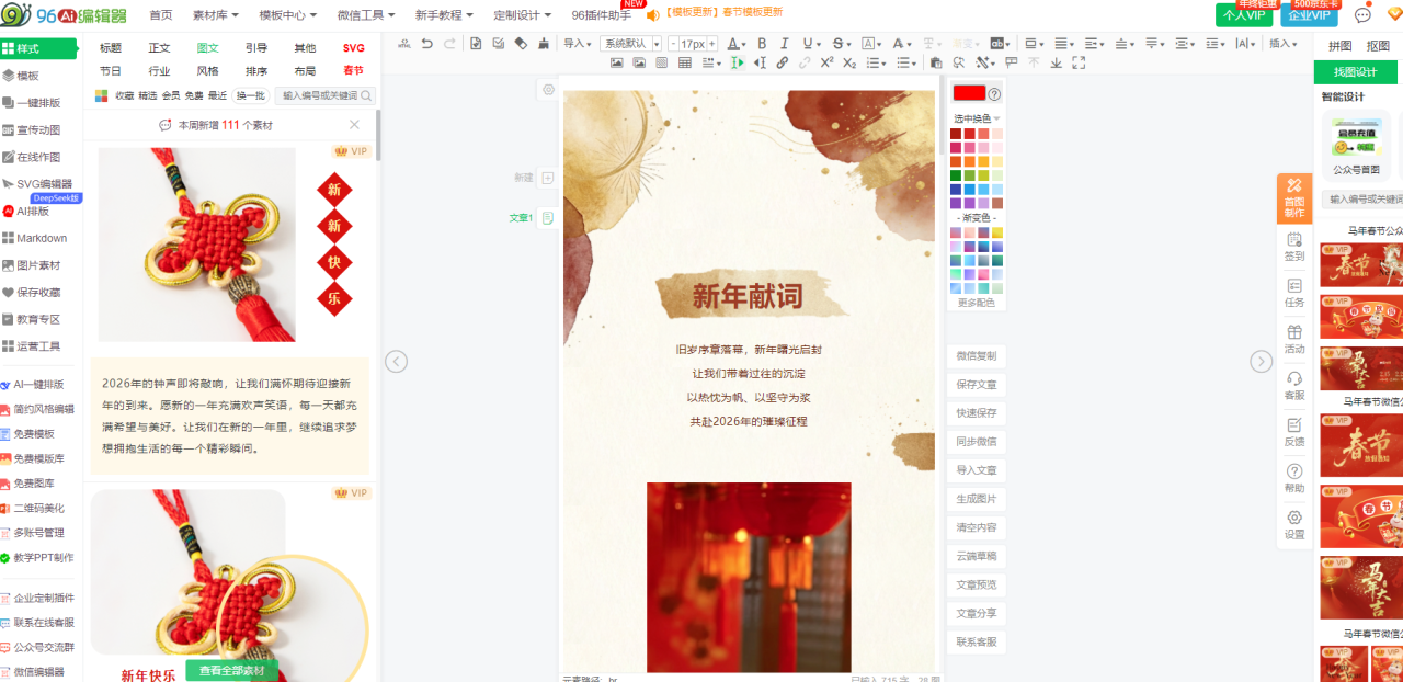素材资源丰富: 内置20万+模板,其中包含6000+套2026春节等节日专属模板,涵盖企业、教育、电商等28个细分行业场景。模板库每日更新100+套优质模板,确保素材与时俱进。