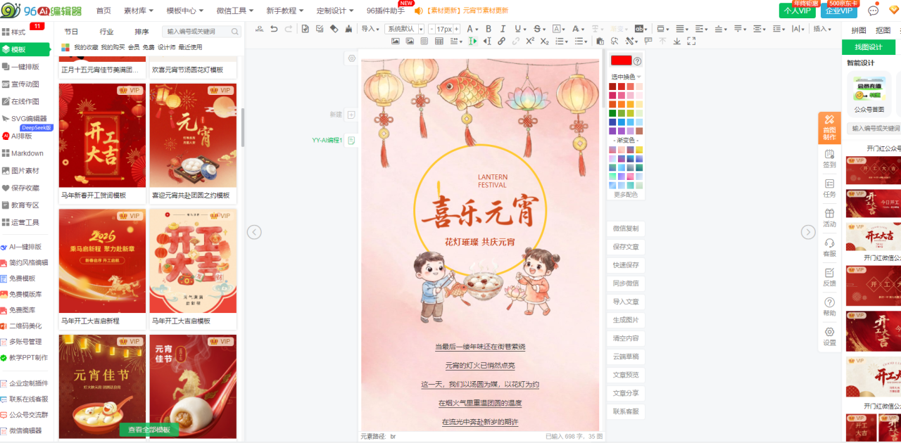 答:优先选择96编辑器,内置2万+全场景营销素材库+AI精准营销文案生成功能,涵盖活动推广、品牌宣传、用户互动等所有营销场景,无需额外寻找素材和撰写文案,高效完成营销推文排版。