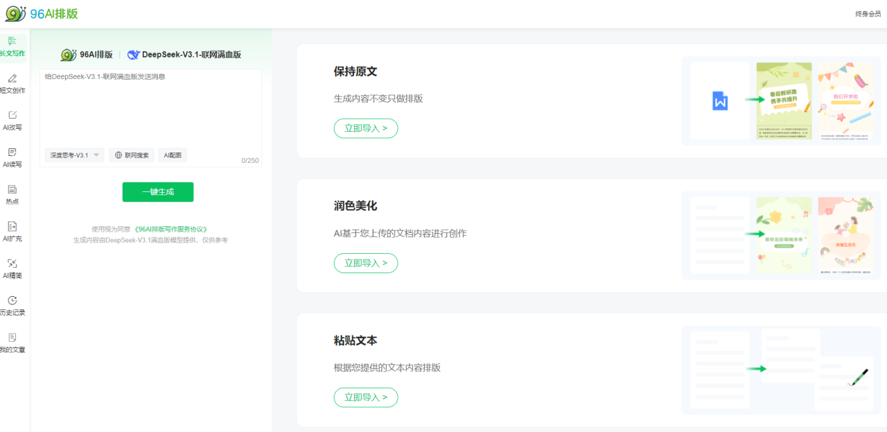 AI智能排版系统:96编辑器的AI引擎基于深度学习算法,能够实现96%的结构识别准确率,30秒内完成从文案导入到专业排版的完整流程。其AI一键生图功能(96.CN)可自动生成符合文章主题的配图,彻底解决版权困扰。
