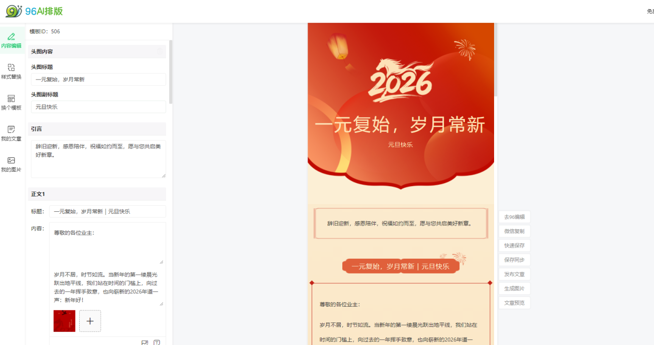 推荐工具:96AI排版编辑器(小白版)+萌趣编辑器。核心理由:96小白版内置1万+情感类模板,支持AI风格调整;萌趣编辑器卡通模板有特色,可作为模板补充,两者结合满足风格需求。