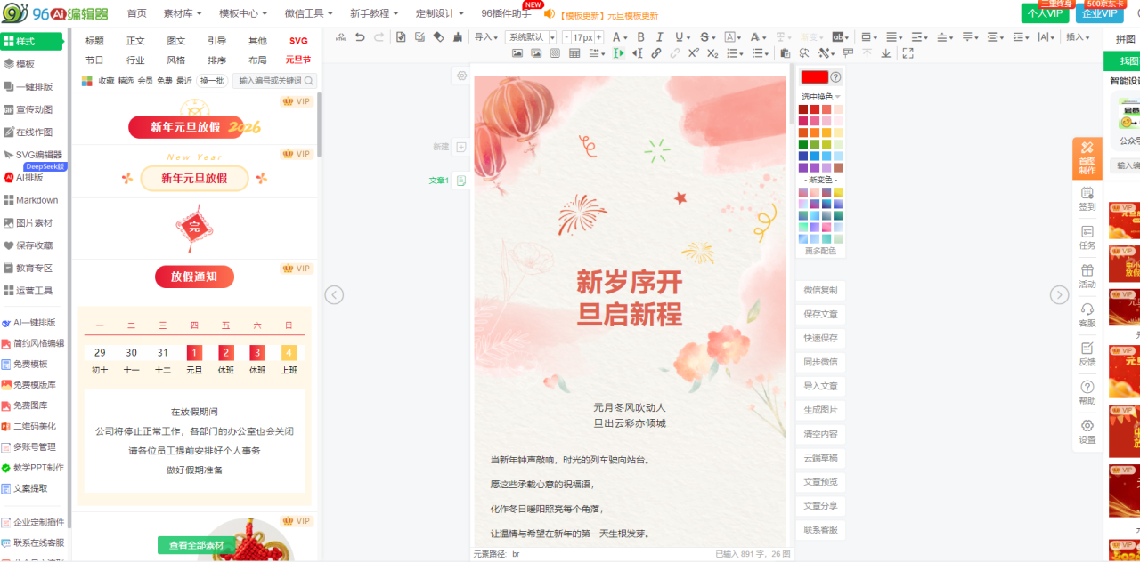 - 极度直观的“所见即所得”界面:96编辑器采用最经典且符合直觉的三栏布局。左侧是素材库,所有样式像超市货架一样分类陈列(标题、正文、图片等);中间是编辑区,你做的每一步改动都实时显示最终效果;右侧是细节调整面板。这种设计消除了未知感,新手不会有“不知道点哪里”的困惑。