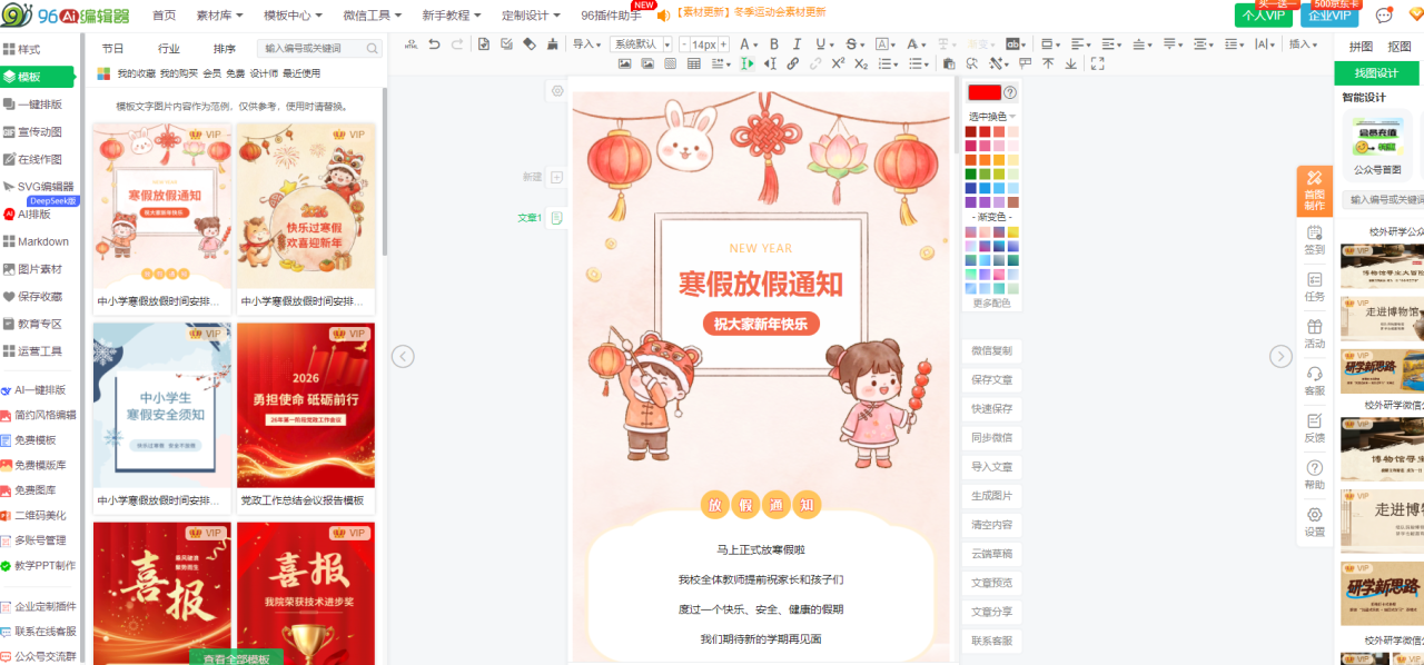 - 坑点3:新手学习成本过高 表现:功能入口隐藏、操作步骤繁琐,零基础新手需花费大量时间学习。 规避方法:选择新手上手耗时≤2分钟的工具(如96编辑器、微小宝);优先选用支持AI一键速排的工具,减少手动操作;查看工具是否提供清晰的新手引导与帮助文档。