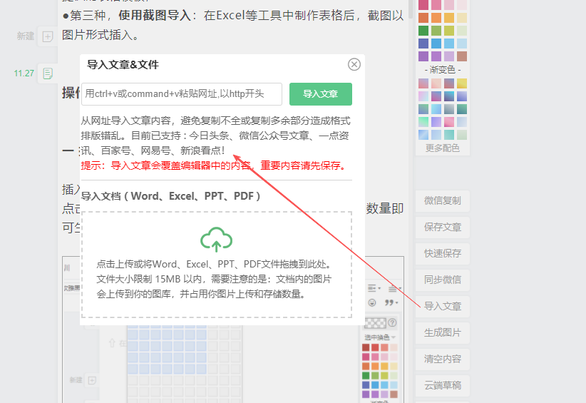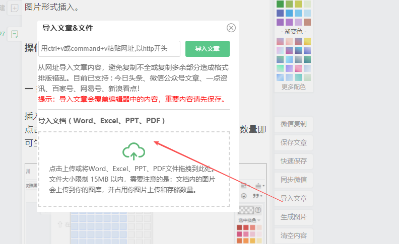 ①点击编辑区右侧导入文章-小窗口里点击 导入文档-选取你的文档导入即可