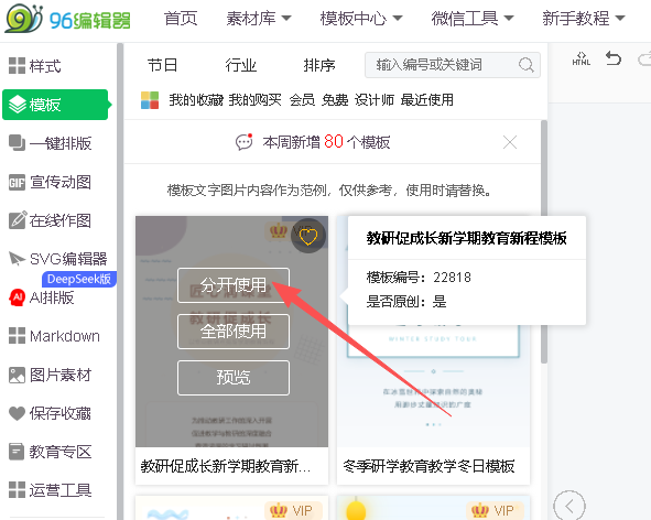 点击模板,鼠标放到要用的模板上,点击分开使用。