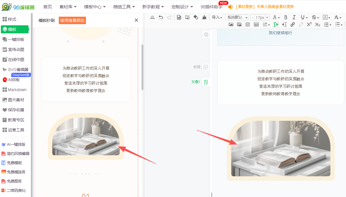 如果要使用整套模板,直接点击插入,模板就会出现在右侧编辑区域,然后修改成自己的内容即可。