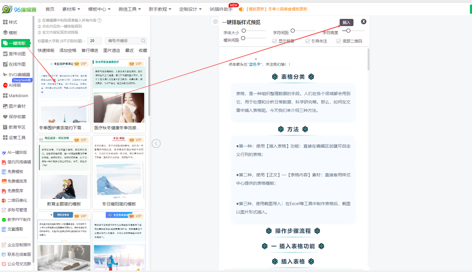 选好模板 → 点「一键排版」→ 一键生成封面、小标题、分割线,发布前再「一键预览」即可