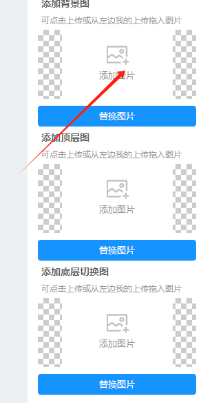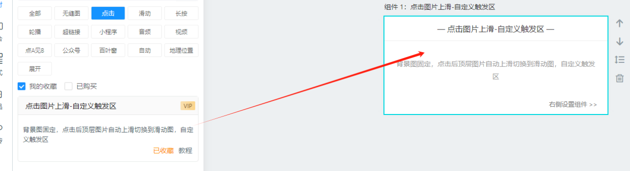 在『素材』栏目下的【点击】里,点击『点击图片上滑-自定义触发区』素材,将其添加到编辑区域。2上传图片素材