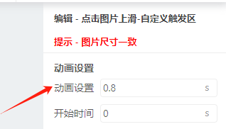3设置动画效果开始时间:点击后动画开始前停顿时间动画时间:单张图片切换的时间4触发区设置鼠标移动编辑区域图片上方的方框,可调整触发热区的位置和大小,该发热区比例不固定,可随意调整大小5同步/导出到微信公众号