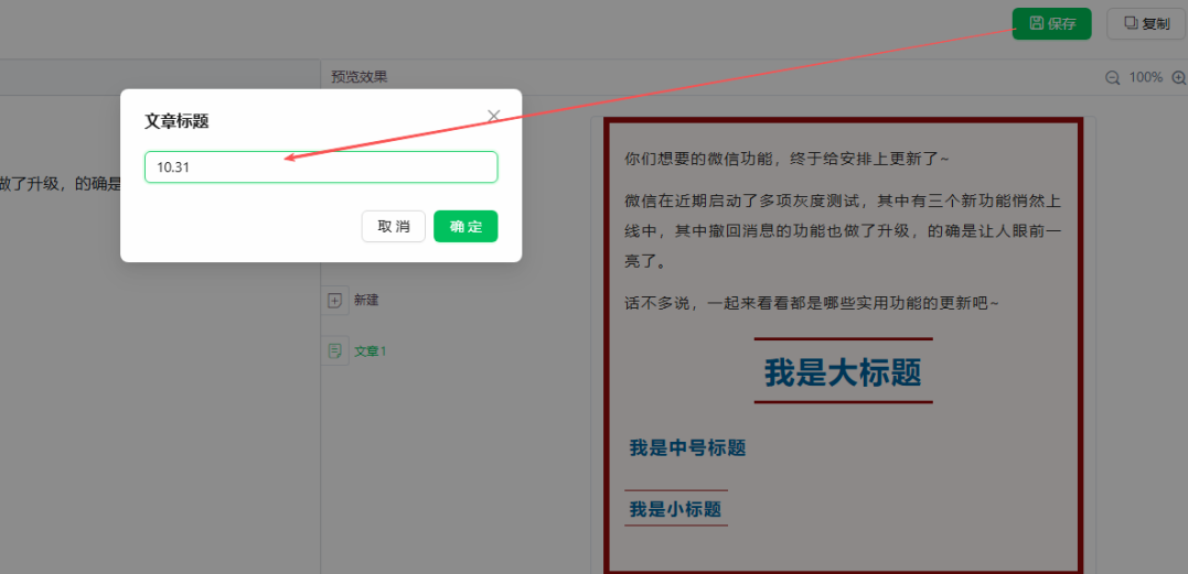 完成文章编辑后,如需保存您的内容,请点击编辑器右上角的「保存」按钮。在弹出的保存窗口中,填写文章标题,然后点击「确认」即可完成保存。已保存的文章会自动存储在您的个人文档库中,方便随时查找和重复使用。