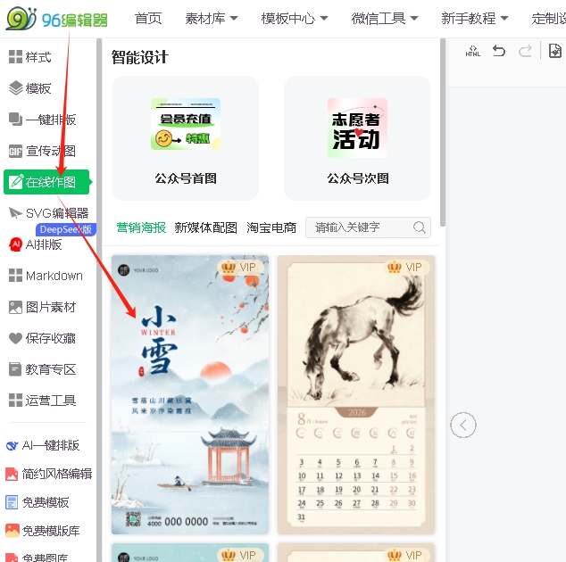 第一步:登录96会员账号后,在左侧菜单栏找到并点击「在线作图」功能。