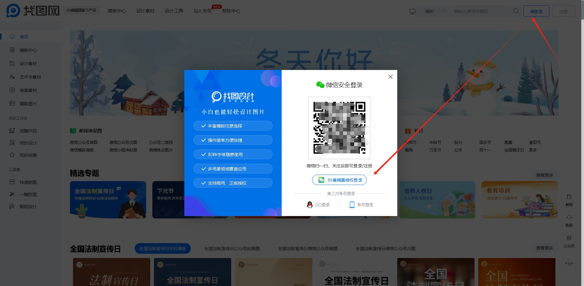 领取找图网终身会员之后,可以直接登录找图网(https://www.zhaotu.com/),点击右上角请登录按钮,选择96编辑器授权登录,登录找图网终身会员账号。