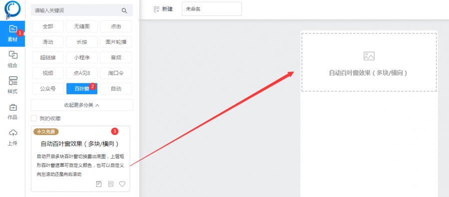 点击素材-百叶窗,选择【自动百叶窗效果(多块/横向)】素材,添加到编辑区域