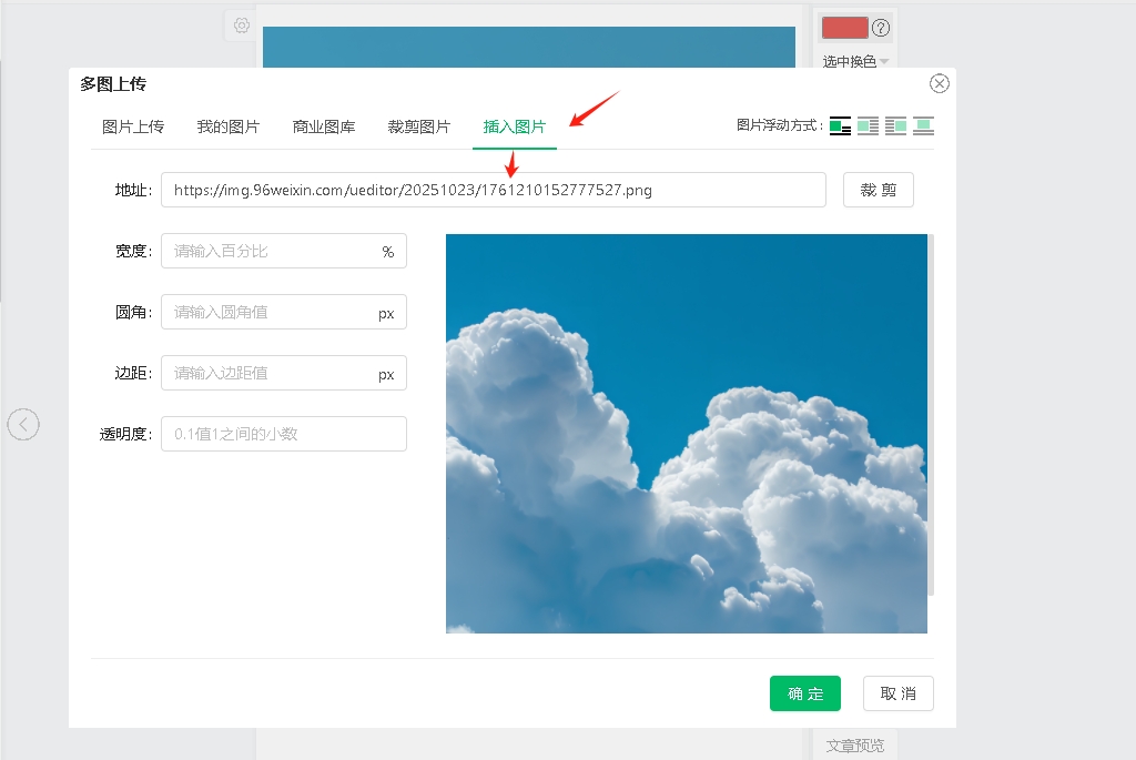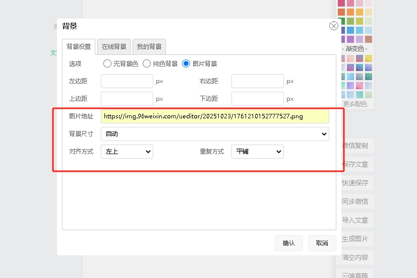 背景设置-图片背景:96编辑器点击图片上传,上传一张想要作为背景的图片,选中图片点击换图,点击插入图片,获取地址;点击图片背景,将刚获取的地址粘贴到图片地址;还支持设置背景尺寸、对齐方式、重复方式;