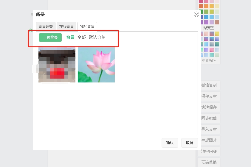 我的背景:点击上传背景,将自己本地图片上传,点击图片,点击确认即可。