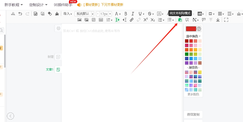 在粘贴任何外部文字前,请务必先在96编辑器工具栏中找到并点击 “纯文本粘贴模式”按钮。此操作将剥离所有外部冗余代码。