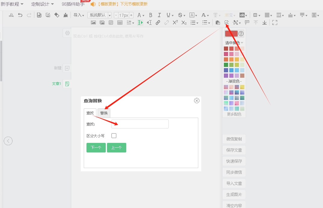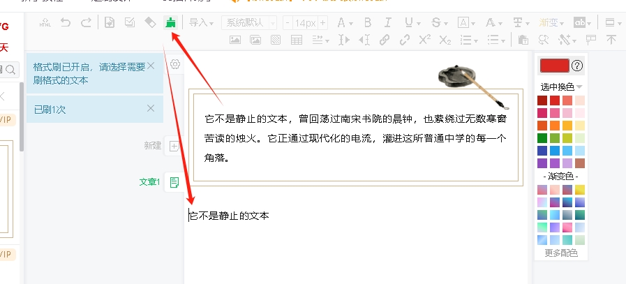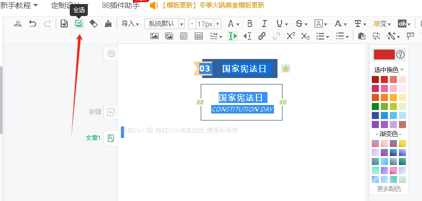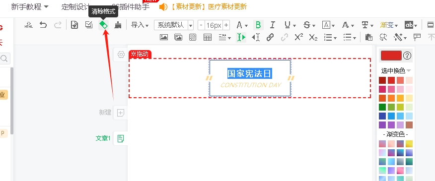 选中模板素材或文章内容点击清除格式,可以快速清除之前设置的格式,也可以用来对外面复制进来文章内容格式的清除。