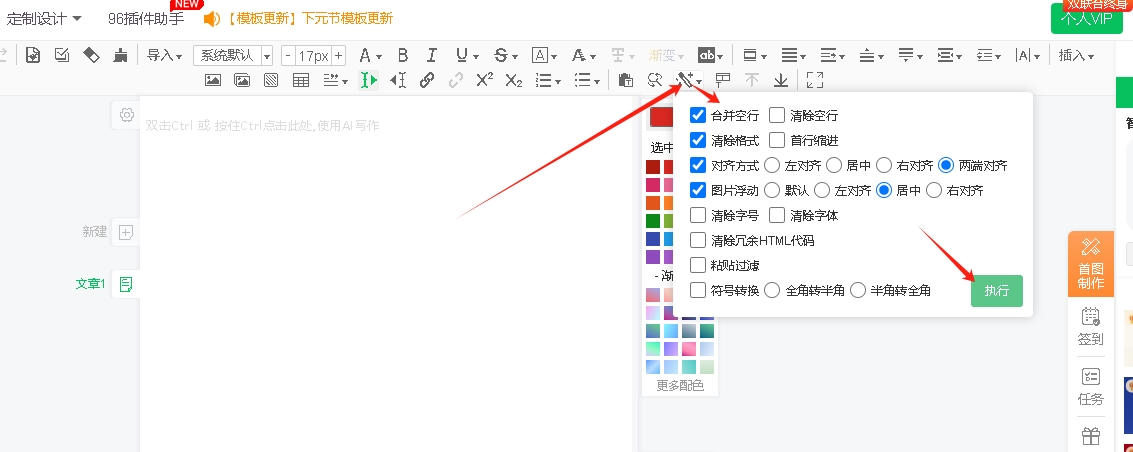 自动排版功能可以根据里面的项目简单的对文章就行排版,选择好需要的样式后点击执行操作,也可以使用编辑器里的一键排版功能排版文章。