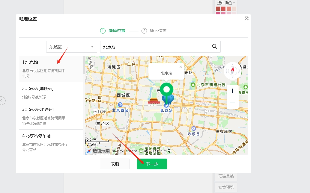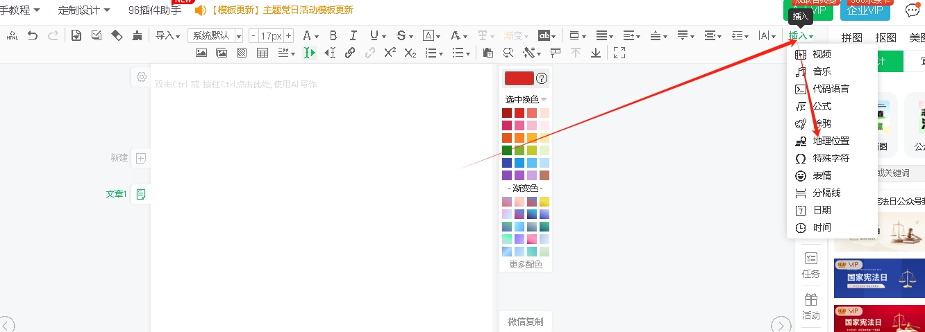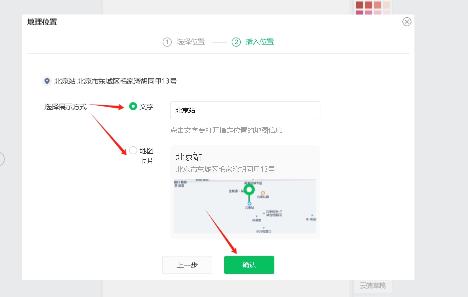 点击插入—地理位置,选择位置,搜索要插入的地点,选中后点击下一步,选择展示方式:文字/地图卡片,点击确认即可插入到文章中。